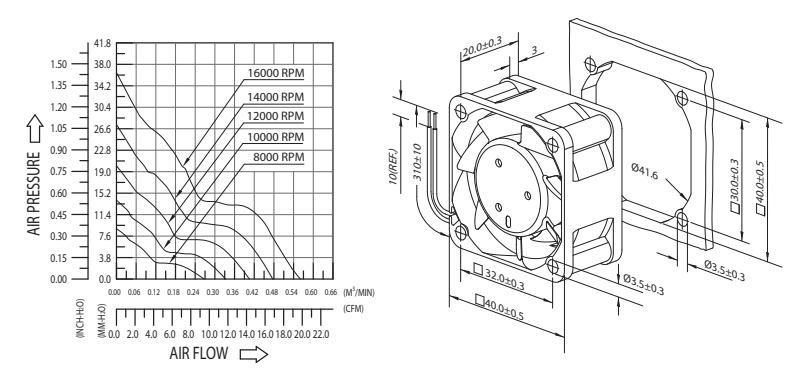 | MODEL | Bearing Type | Rated Voltage | Operating Voltage Range | Rated Current | Rated Input Power | Speed | Maximum Air Flow | Maximum Air Pressure | Acoustic Noise | Life expectancy | |||
