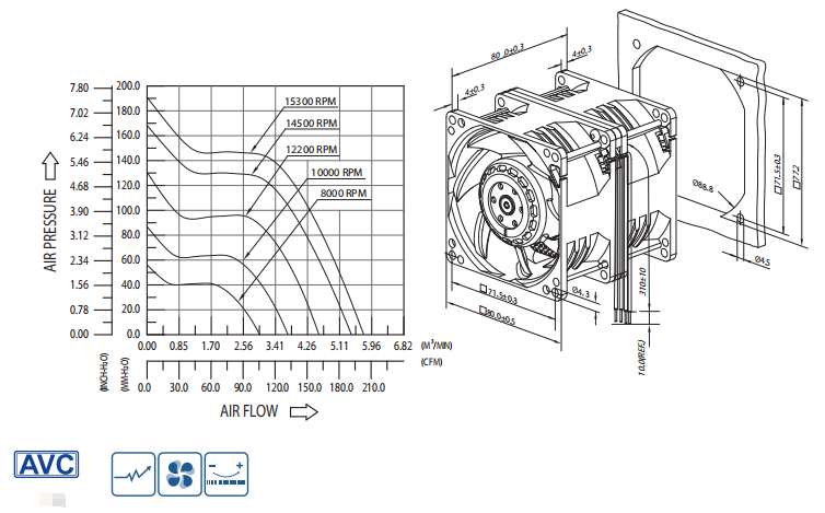 | MODEL | Bearing Type | Rated Voltage | Operating Voltage | Current | Input Power | Speed | Air Flow | Air Pressure | Acoustic Noise | Life expectancy | |||