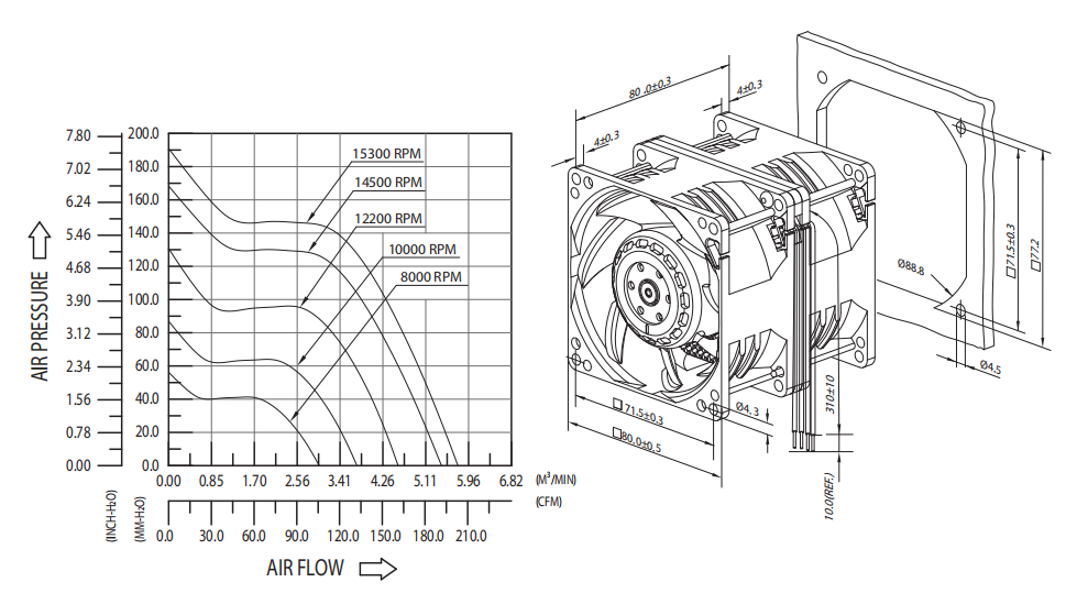 | MODEL | Bearing Type | Rated Voltage | Operating Voltage | Current | Input Power | Speed | Air Flow | Air Pressure | Acoustic Noise | Life expectancy | |||